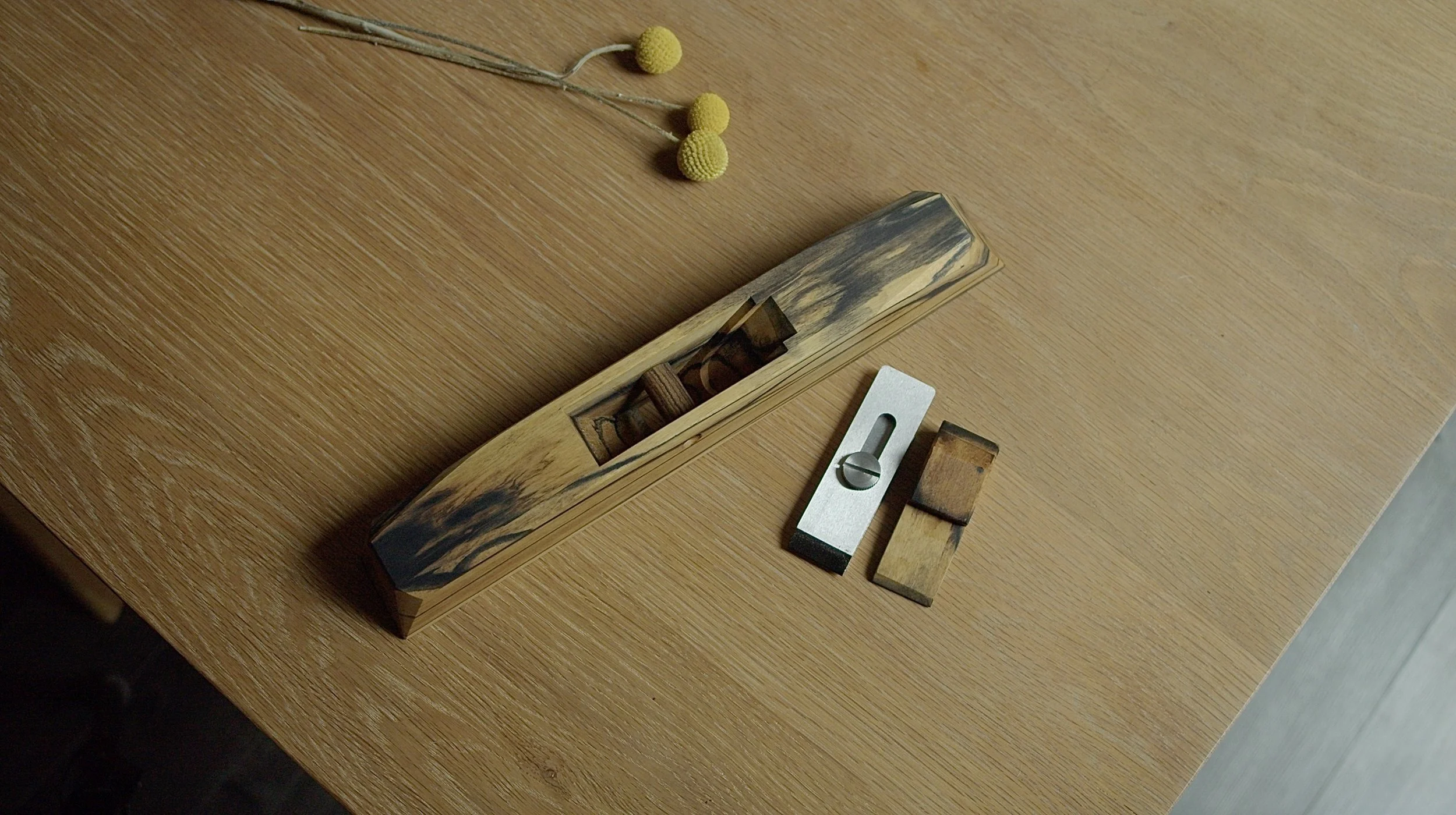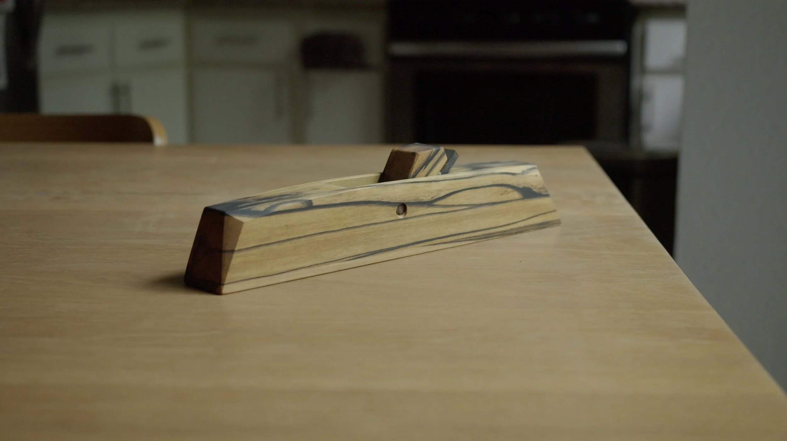 Black and white ebony 1” hand plane. Featuring a bocote sole and Krenov-style construction.